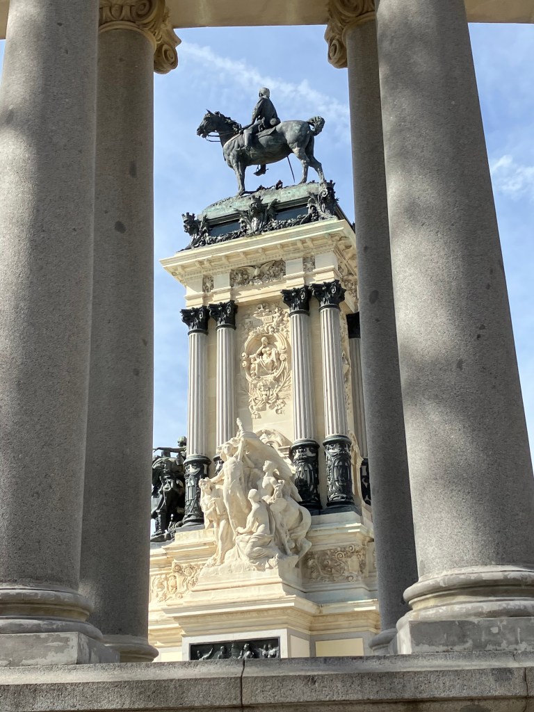 Walking the 20 minutes, past the Prado, we entered through the Felipe IV gateway and headed straight for the lake. This artificial lake, on which you can hire rowing boats, is overlooked by the monument to Alfonso XII of Spain and features a semicircular colonnade and an equestrian statue of the monarch on the top of a tall central core. Visitors splay themselves on the steps of the monument and across the colonnades so getting a tourist free photo is never easy.