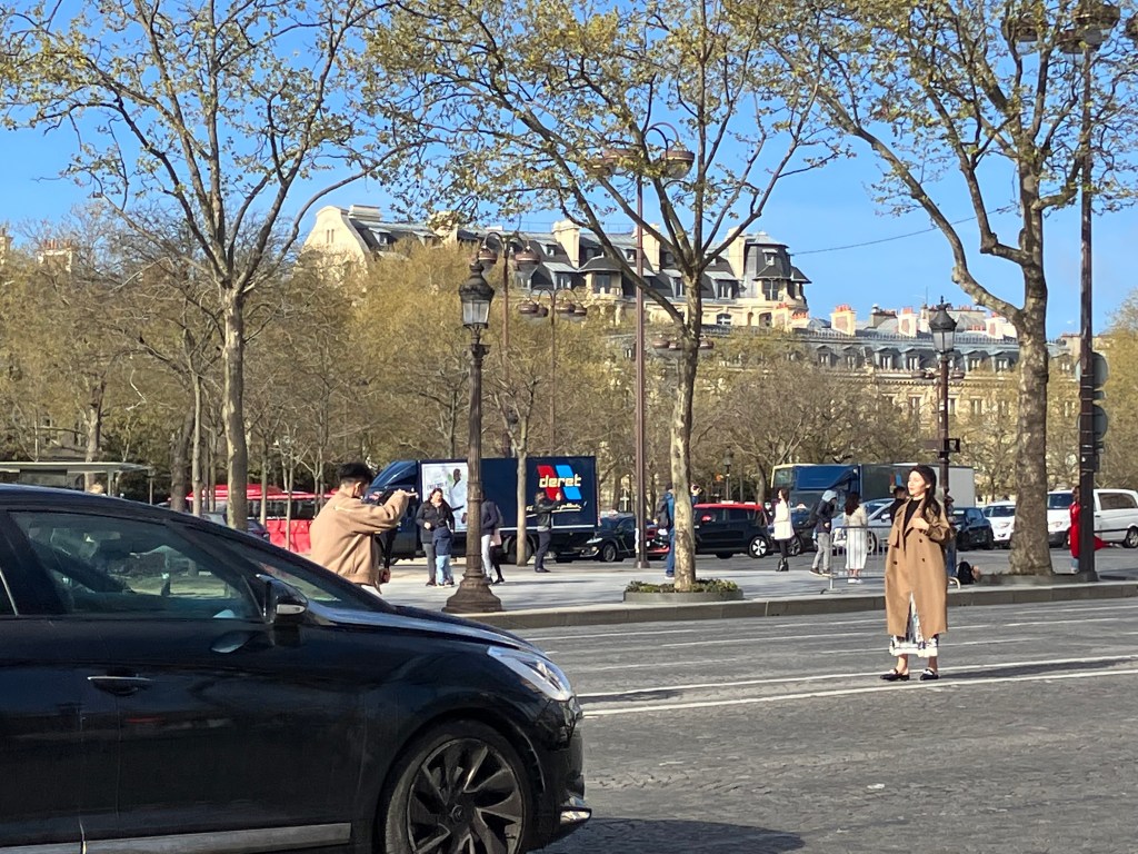This was going to be my final example but I have had to add this last photo which I only took today. This photo shows a young girl and her male partner, both of Asian descent, walking up the centre line of the Champs Elysee in order to get the perfect picture of the Arc de Triomphe. If you have ever been there you know how busy it is with traffic!