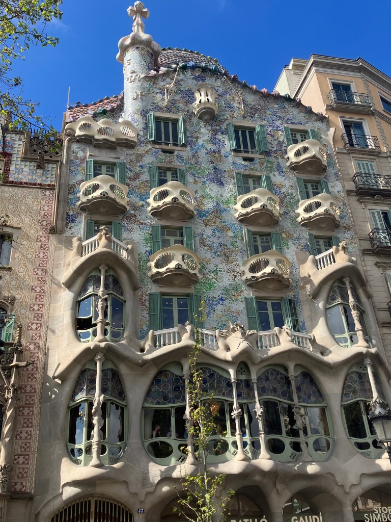 Finally the third house, in the middle, is Casa Battlo designed by Gaudi and completed in 1907. It is several metres taller than the other two and Gaudi’s idea was to utilise the exterior to illustrate the legend of St George (who is Catalonia’s patron saint) The green and blue ceramic cladding on the walls represents the dragon’s scaly skin, the curved roof-top it’s crested back and the balcony railings and pillars the bones of the dragon’s victims. He had quite an imagination!