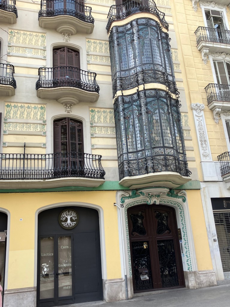 We also saw examples of sgraffito which is defined as a form of decoration made by scratching through a surface to reveal a lower layer of a contrasting colour, typically done in plaster or stucco on walls. Casa Manuel Llopis (below) is an example of this, built in 1903 by Anton Gallissa i Soque with sgraffito by Josep Maria Jujol, who also worked on several of Gaudi’s projects.