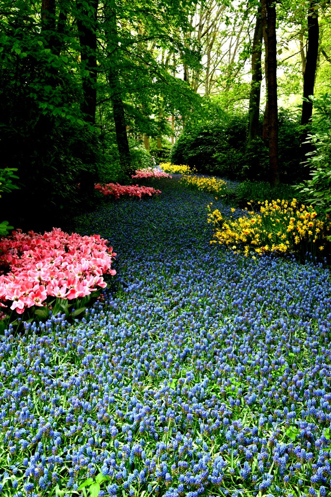 My favourite area of this type is a river of grape hyacinths winding its way amongst some trees with a quick dash of yellow daffodils and pink tulips thrown in for colour. Who on earth dreams up these ideas?