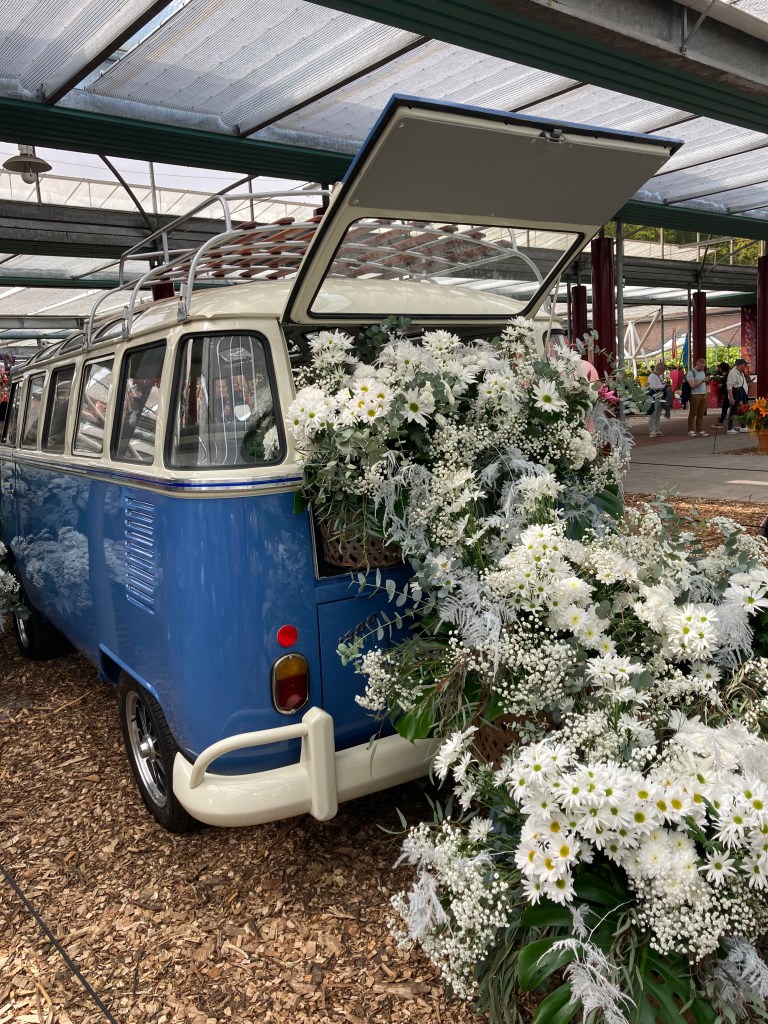 The flower arrangements cover all manner of events and ideas- a blue VW camper with pure white flowers spilling from the rear that you could create for a wedding, a Valentines display with red hearts and gorgeous pink lilies