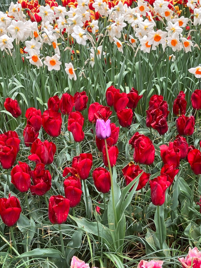 Nature brings beauty in other formats too like the tiny droplets of dew still on some of the petals. Or the production of one single purple tulip amidst a border of red tulips, which makes me smile, as if nature is trying to tell us we cannot always produce the perfection we desire!