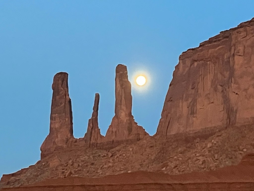 The sandstone buttes, for which the Valley is so well known climb from a height of 400 feet up to 1000 feet and at this time of the morning we were fortunate to see the moon still glowing to the west, framed by two such buttresses whilst the sun was rising on our left, to the East. It was a once in a lifetime sight.