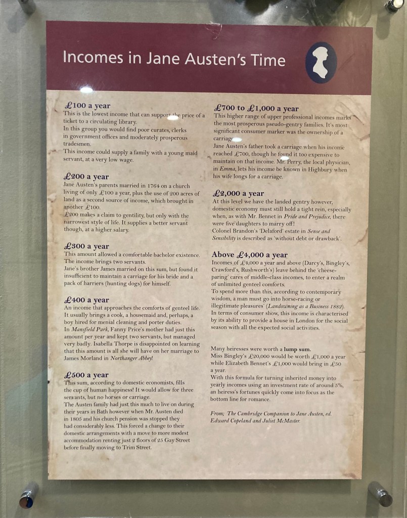 There are some interesting exhibits including an explanation of monetary income during Jane’s era, a feature that arises many times in her books when various mothers are looking for appropriate suitors for their daughters.