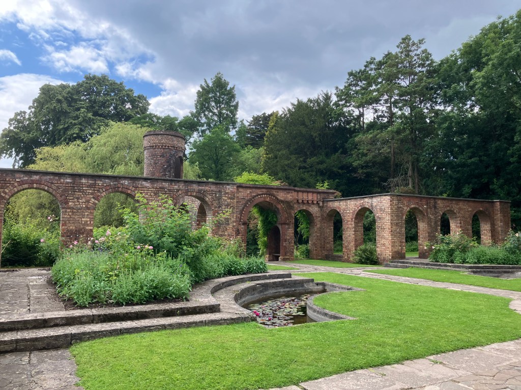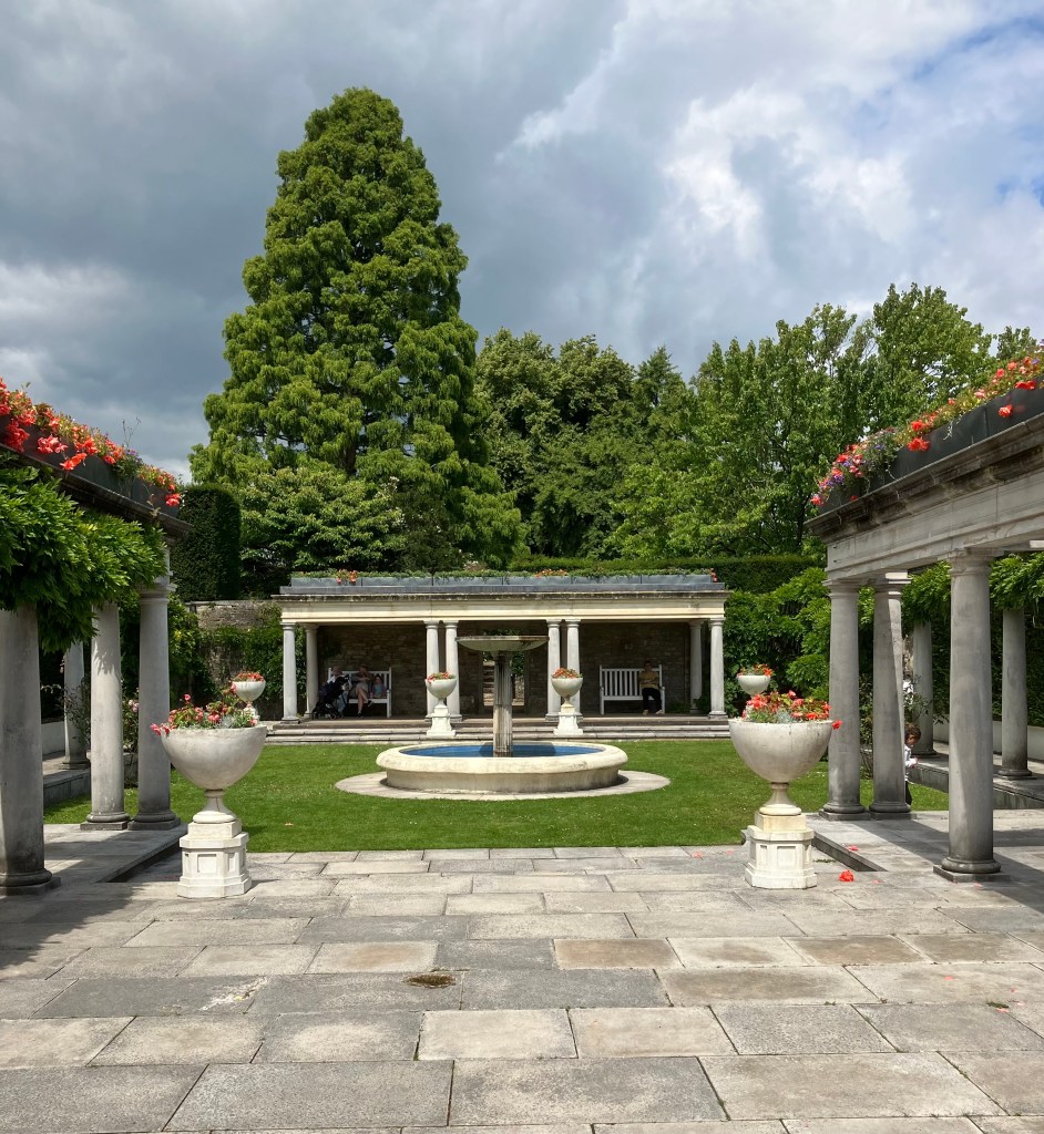Wandering onwards into the Paved Court we admired the classic topiary and colourful urns and borders before entering the Pompeian Garden which is definitely one of the highlights. Utilising a watercolour painted by Edith Adie, restoration on this area began in 2016 and continues to this day. You do feel like you have wandered into the inner courtyard of a Roman garden belonging to a rich merchant. The central fountain provides a focal point surrounded by colonnades with colourful rooftop flowers, shaded seating and Roman statues and urns.