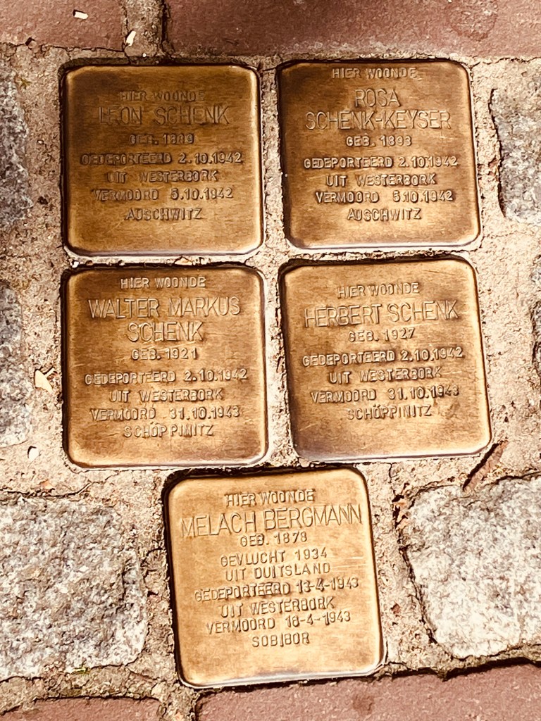 The names engraved upon the stones are of the Jewish people who used to live here before the Second World War. In this example the top two are the parents and the middle two are the young sons of the Schenk-Keyser family, all of whom were forced to leave on October 2nd 1942. The parents died a few days later in Auschwitz, while the sons survived a year in a labour camp in Poland . The final stone is for Melach Bergman, who had already fled the troubles in Germany in 1934, was then picked up in April 1943 and murdered a few days later in Poland.