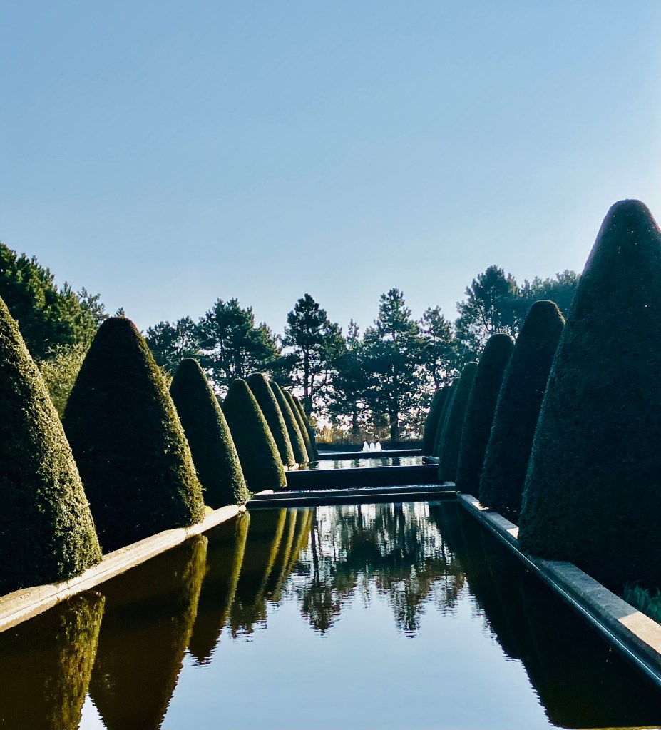 The view to the right at Oranje Nassau is one such case in point with a conical avenue of evergreen trees, smartly trimmed, reflecting in the narrow expanse of water as it stretches to the fountain beyond.