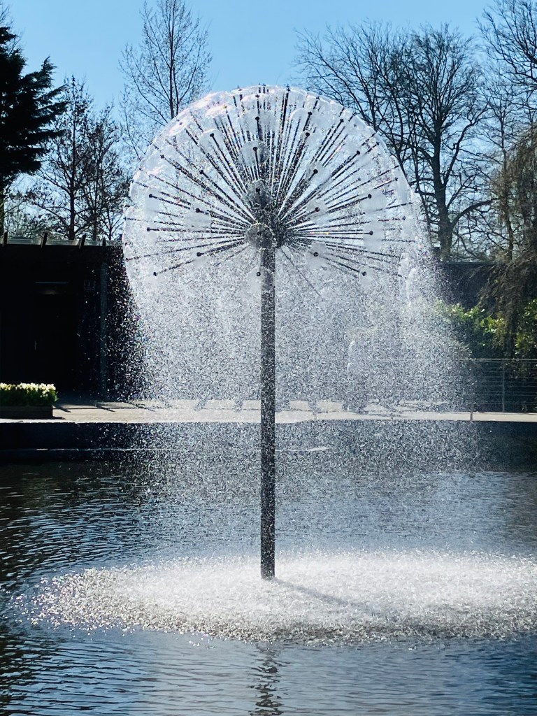 We leave this display building by the rear exit, opposite where we had come in, and take the path opposite heading back out into the grounds and down towards the lake. The path takes us once again over and alongside various water features. The lake, itself, is quite a feature of Keukenof with it’s central spray fountain, modern sculptures and of course flower beds that meander alongside the natural curve of the lake:
