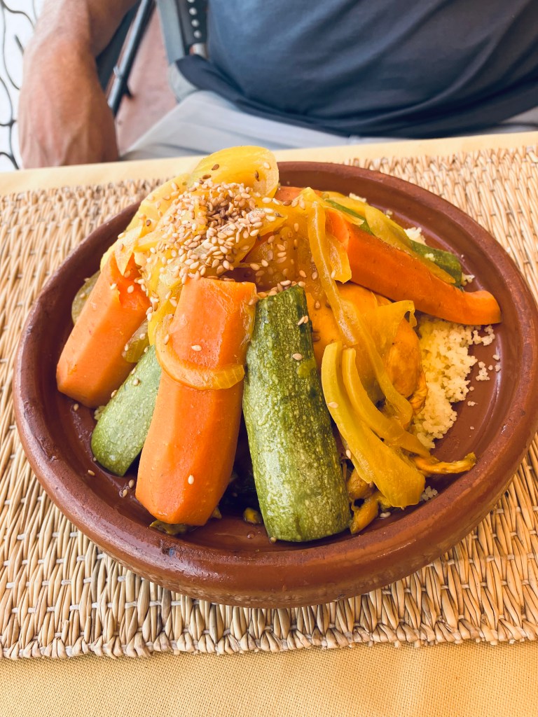 Exploring the main Jemaa el-Fna square in the early evening before it became too busy I had read really good reviews on the Zeitoun Cafe but when we arrived hubby wasn’t sure and instead wandered off to the Cafe Rouge and having examined the menu decided we should try it. The food on presentation looked ok with hubby choosing this couscous dish: