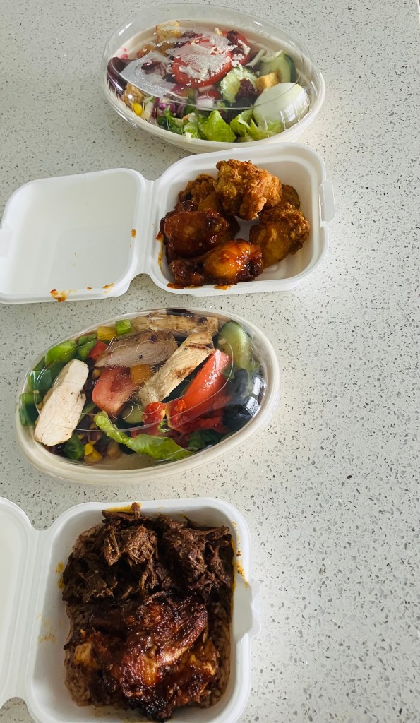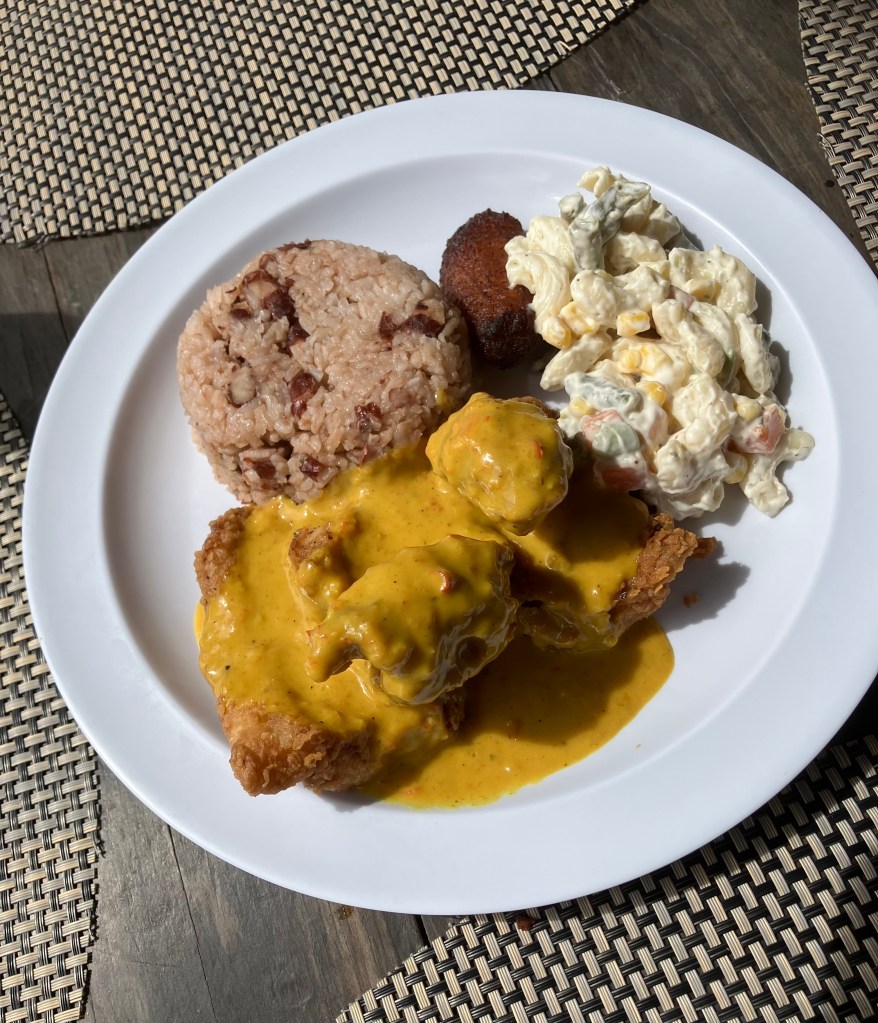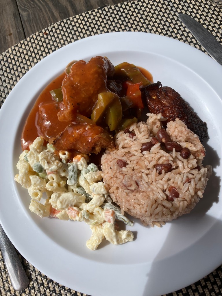 We opted for the pork ribs and beef short ribs which were served as usual with fried plantain, potato salad and rice n peas. There’s always a home made piece of cassava cake on the side and I love their swanky!