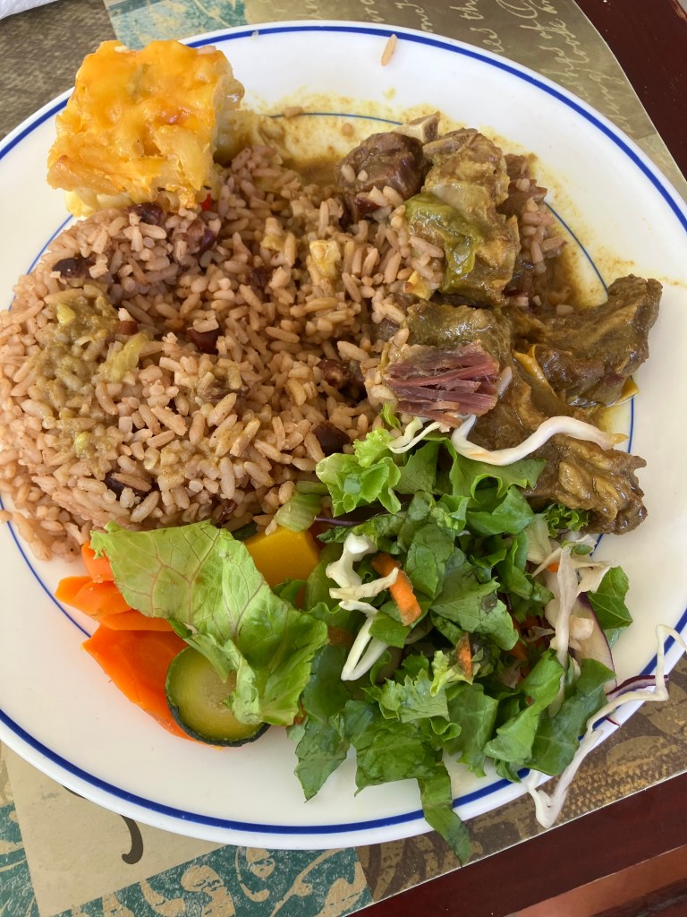 This place is a true beachside gem, serving authentic island cuisine in generous portions at reasonable prices. The food clearly takes centre stage, with standout dishes like curry goat and garlic shrimp, all served with rice, salad, and macaroni pie.